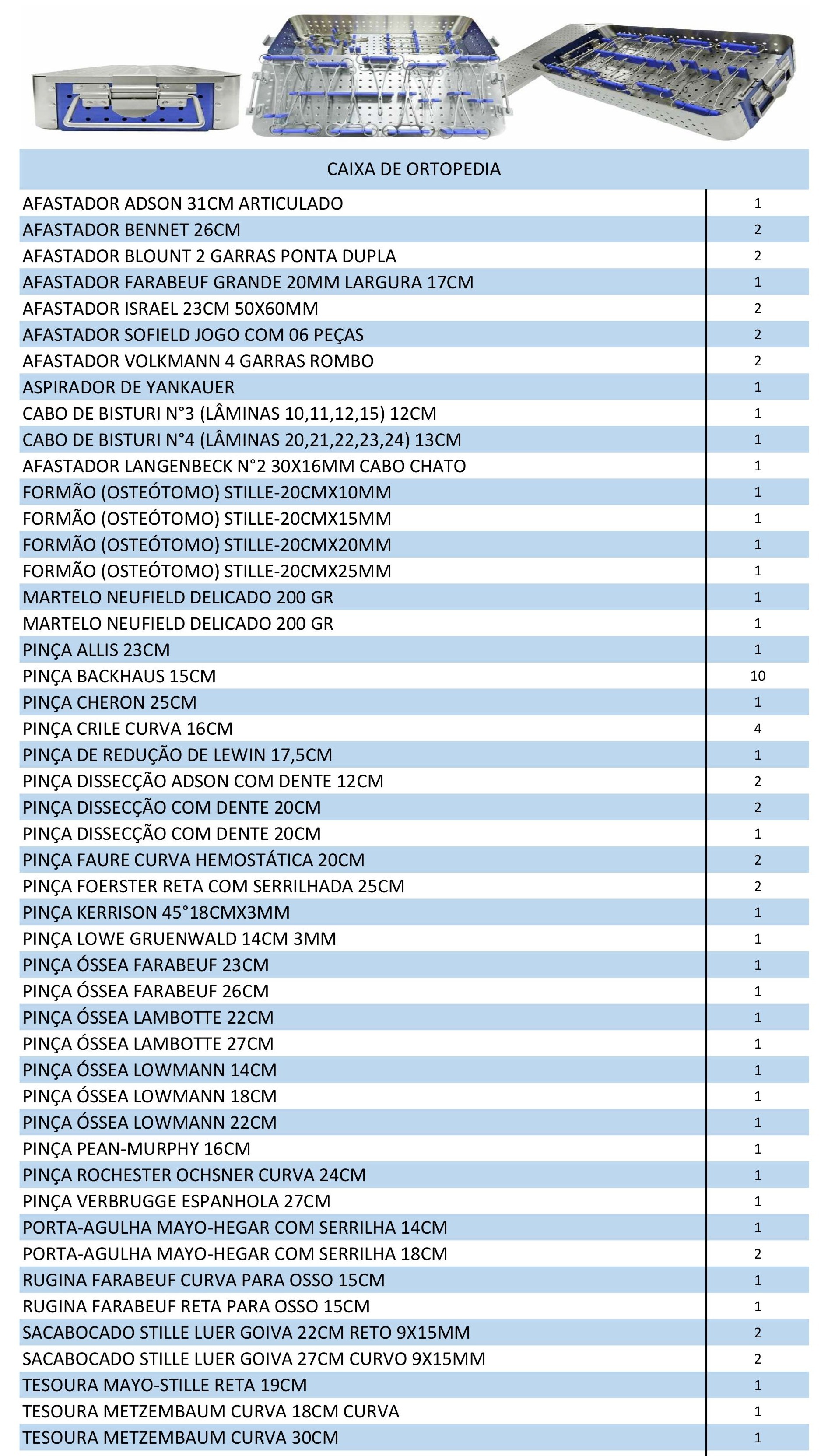 A Caixa Cirúrgica para Ortopedia contém instrumentos específicos para procedimentos neurocirúrgicos e ortopédicos envolvendo a coluna vertebral. A Ortopedia é um procedimento realizado para aliviar a compressão da medula espinhal ou das raízes nervosas, geralmente causada por hérnias de disco, estenose espinhal ou tumores.