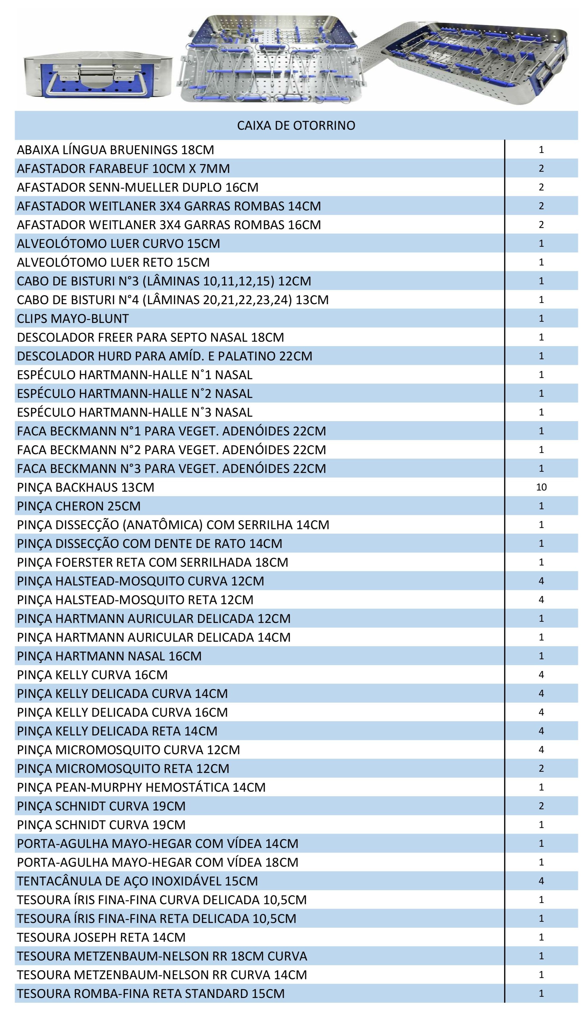 A Caixa Cirúrgica de Otorrinolaringologia (Otorrino) contém instrumentos especializados para procedimentos cirúrgicos que envolvem nariz, garganta, ouvidos e estruturas associadas. Esses instrumentos são utilizados em cirurgias como septoplastia, amigdalectomia, timpanoplastia, turbinectomia e rinoplastia.