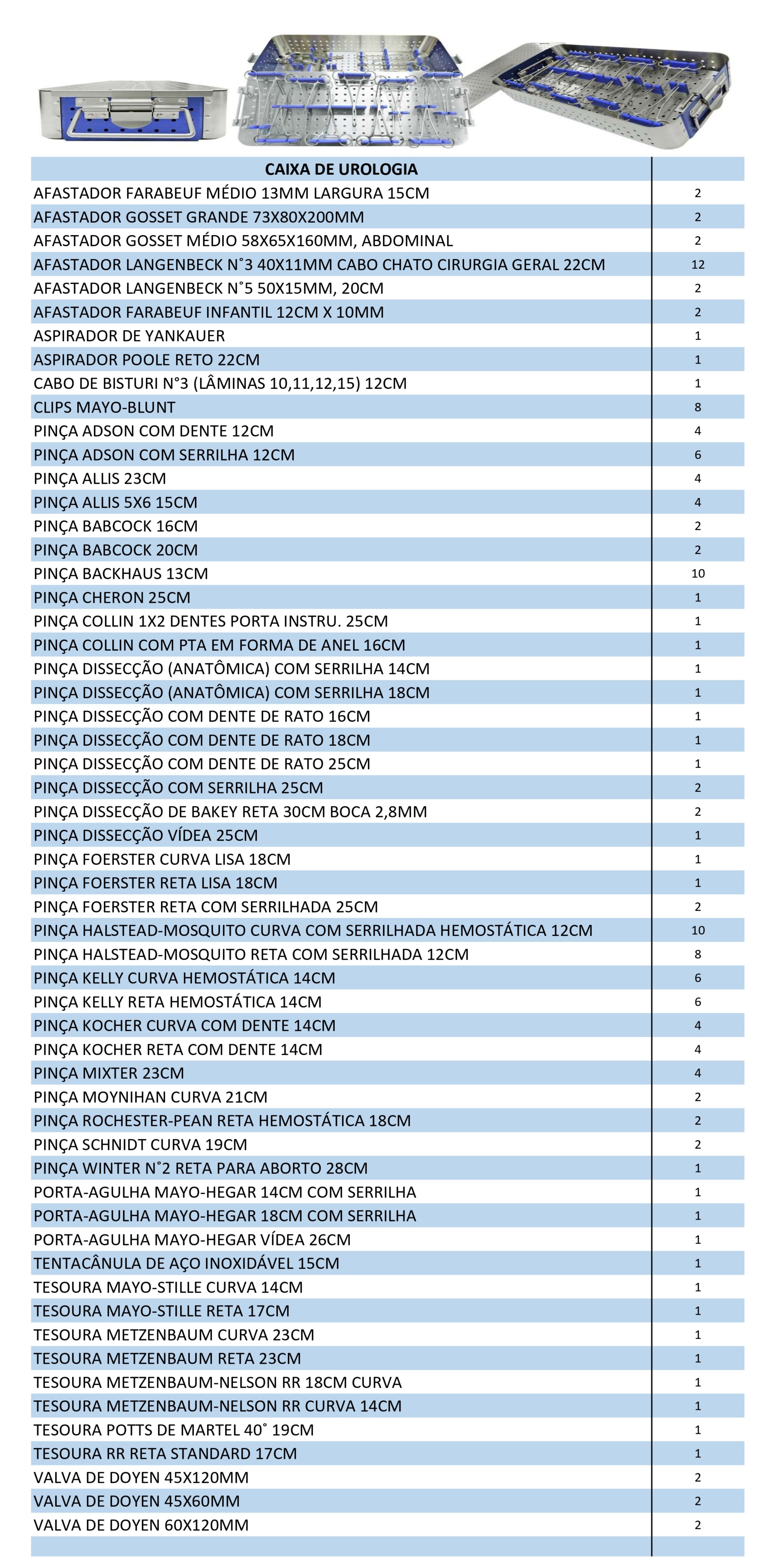 A Caixa Cirúrgica de Urologia contém instrumentos essenciais para procedimentos cirúrgicos no sistema urinário masculino e feminino, incluindo rins, ureteres, bexiga, próstata e uretra. Essa caixa é utilizada em cirurgias abertas, laparoscópicas e endoscópicas, garantindo precisão e segurança ao cirurgião.